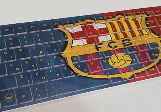 מקלדת מחשב דקה עם כפתורים שטוחים (chocolate keys), עם גרפיקה / תמונה המסופקת ע”י הלקוח מוטבעת על גוף המקלדת.